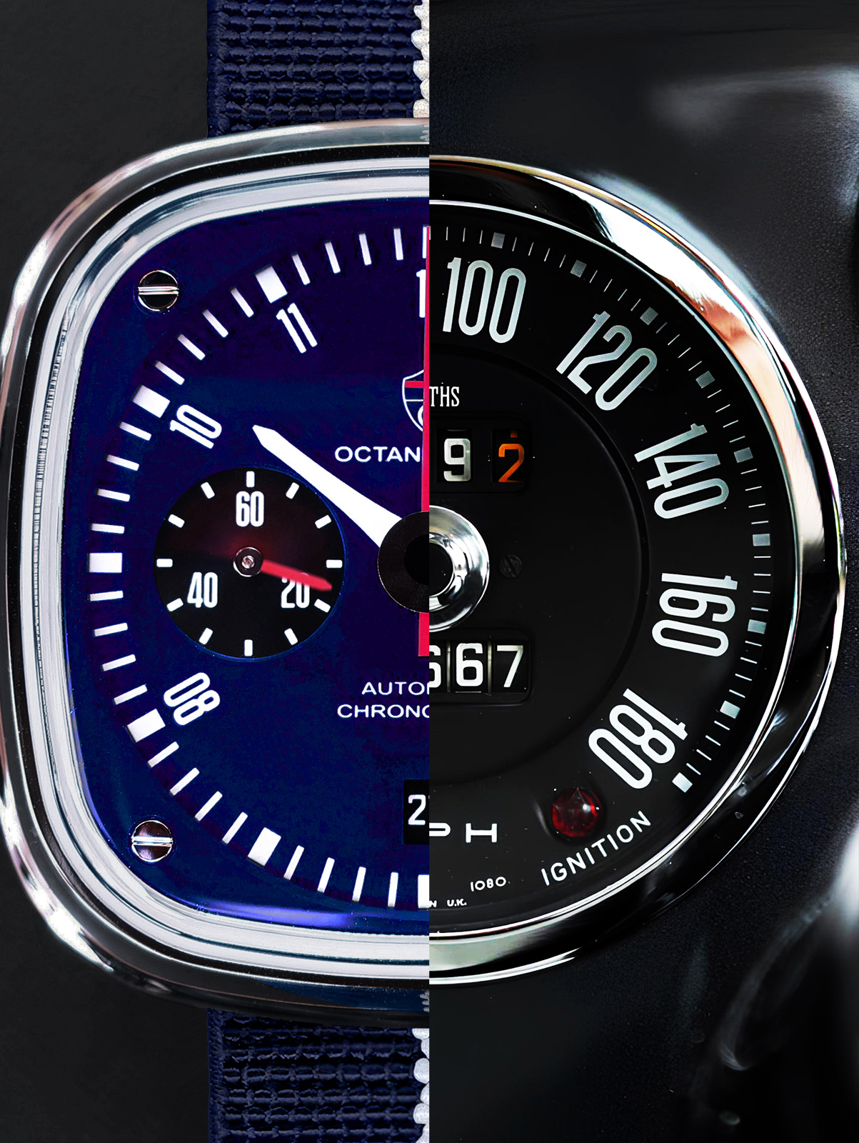 Inspired by the speedometer and front grille of the iconic Aston Martin DB5, the Octane & Lock Newport Pagnell takes its name from the historic home of the British marque, where a little over 13,300 Aston Martins (including 1,022 DB5s) were hand-built between 1955 and 2007.